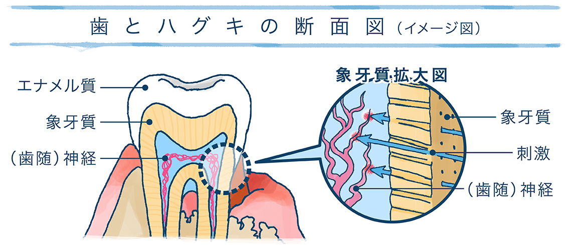 知覚過敏とは、むし歯ではないのに、冷たいものや熱いもの、甘いものやすっぱいものがしみる症状です。そのほかに、ハブラシの毛先がしみる場合もあります。