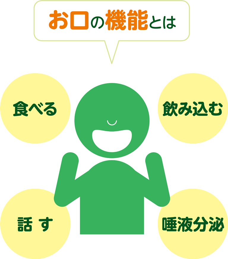 食べるためには、口を開けて食べ物を口に入れ、歯でよく咀嚼し、飲み込む、といった一連の流れがあります。そのためには唾液が必要になるため、唾液の分泌も大切なお口の機能なのです。