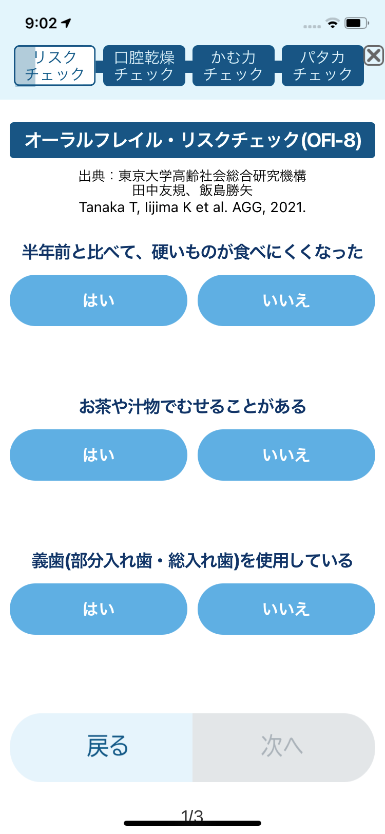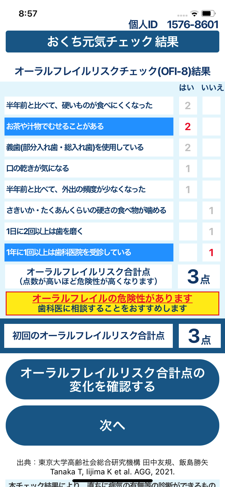 東京大学高齢社会総合研究機構 田中友規、飯島勝矢ら(Tanaka T, Iijima K et al. AGG, 2021.)の研究により開発された「オーラルフレイルに対する簡易スクリーニング質問票」です。オーラルフレイルのリスクの高さがわかります。