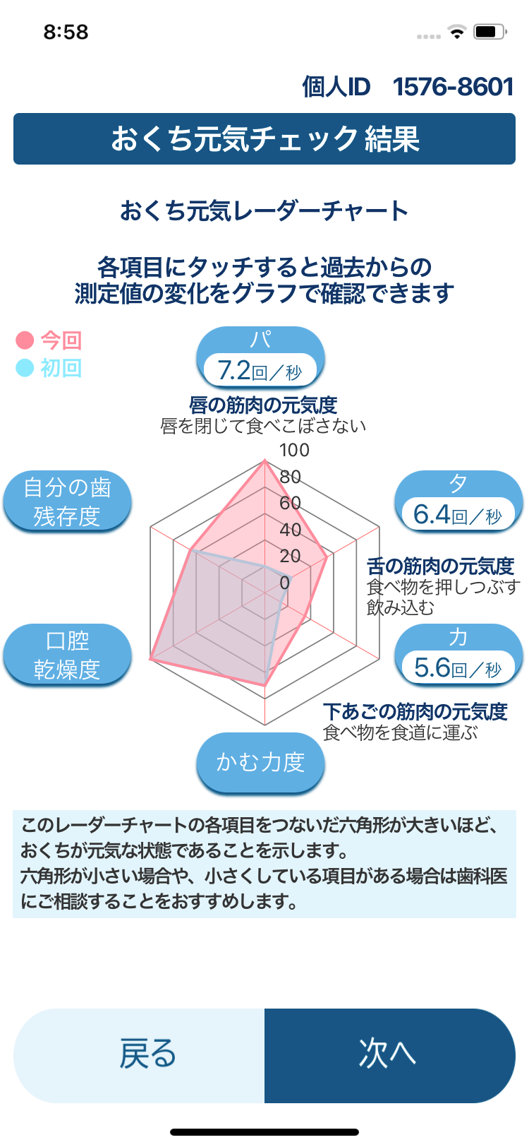 それぞれのチェックの結果から、あなたの「おくち元気度」がわかります。値とともに、レーダーチャートを見ることができます。六角形が大きいほど、お口が元気な状態。逆に小さくなっている部分があったら注意が必要です。このチェックは、初回からのチェック結果の移り変わりを簡単にみることができるので、定期的に実施すれば「おくち元気度」がよくなっているのか悪くなっているのかが視覚的にわかります。