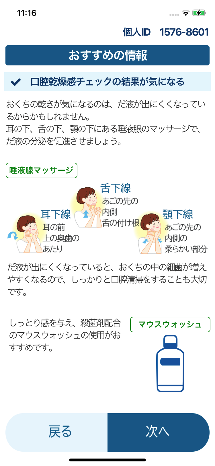 簡単な質問に答えていくだけで「おくち元気度」が確認でき、おすすめのケアの方法も教えてくれます。
