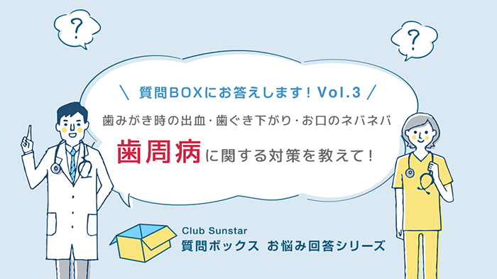 会員さんからお悩み質問BOXに寄せられた質問にお答えします。今回は多くのみなさんから寄せられた「歯周病」に関して、編集部がピックアップしたご質問をサンスター財団の歯科衛生士野田めぐみさんにお答えいただきました。