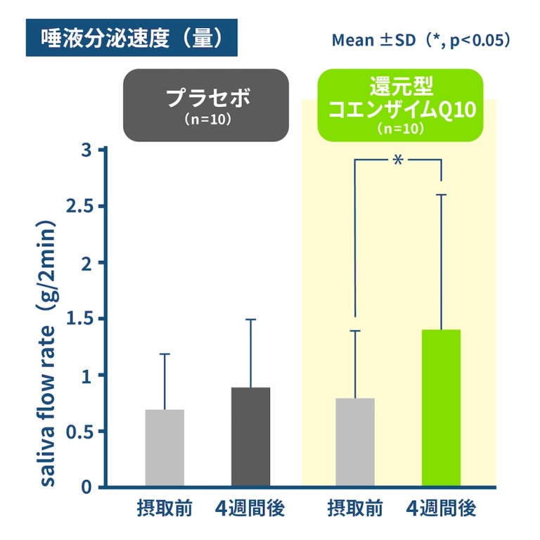 「ドライマウス患者に、4週間にわたって還元型コエンザイムQ10を摂取してもらう試験の結果、摂取後に唾液分泌量が増えたことがわかっています」