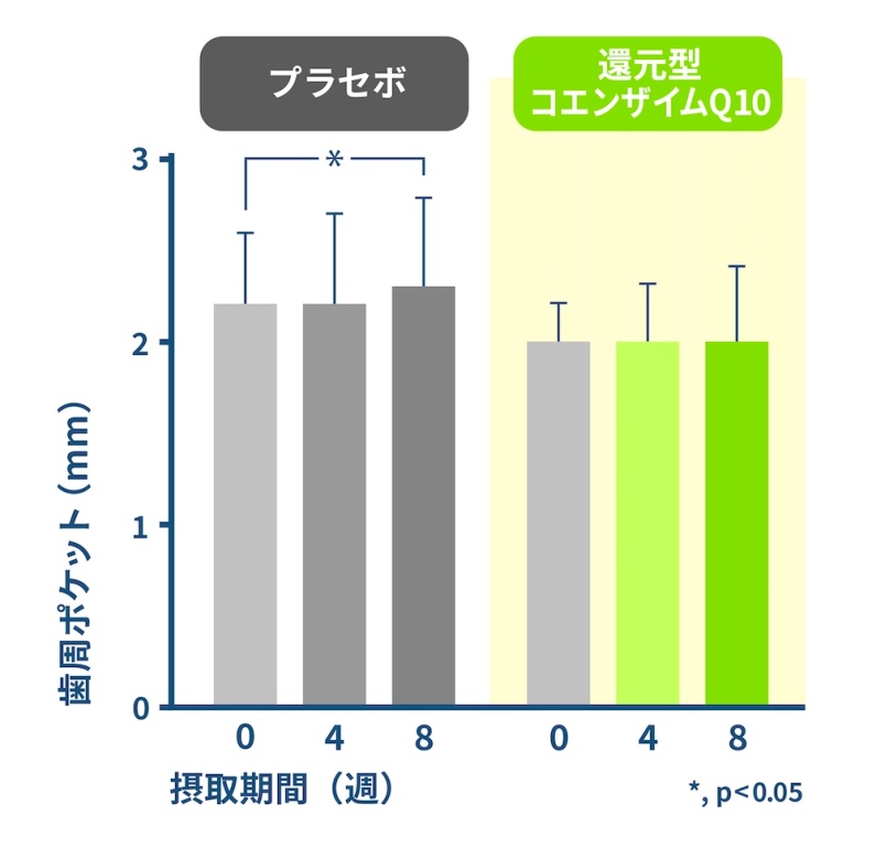 「この試験では、軽度~中度の歯周病患者に、還元型コエンザイムQ10を8週間摂取してもらいます。摂取開始4週間後と8週間後に口腔内診査と唾液採取をするというものです。結果は、還元型コエンザイムQ10の摂取により、プラーク付着量は有意に低下し、歯周ポケットの増加はありませんでした。また、歯肉出血点も有意に低下し、口臭も低下傾向だったと報告されています。これらは、還元型コエンザイムQ10が歯周病による口腔内症状を改善する可能性を示しています」