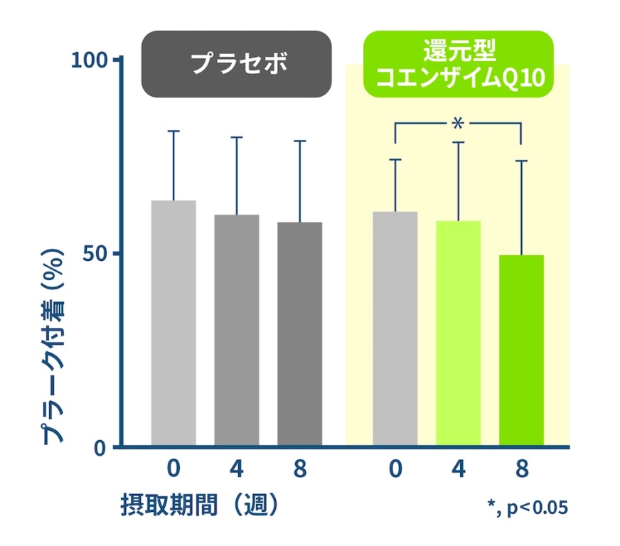 ドライマウス患者だけでなく、歯周病患者に還元型コエンザイムQ10を摂取してもらう試験の結果もあるそうです。なお、歯周病はプラーク(歯垢)の中の細菌によって歯肉の炎症や腫れを引き起こすだけでなく、歯を支える骨を溶かして、歯を失うことにつながる疾患です。