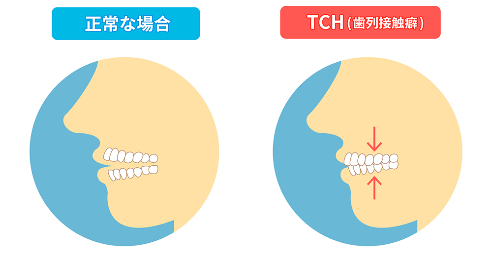 一方、咀嚼筋痛の場合は、食いしばり癖や歯ぎしりが原因になります。無意識のうちに上下の歯を接触させてしまうTCH(Tooth Contacting Habit=歯列接触癖)も、咀嚼筋痛の原因となります。