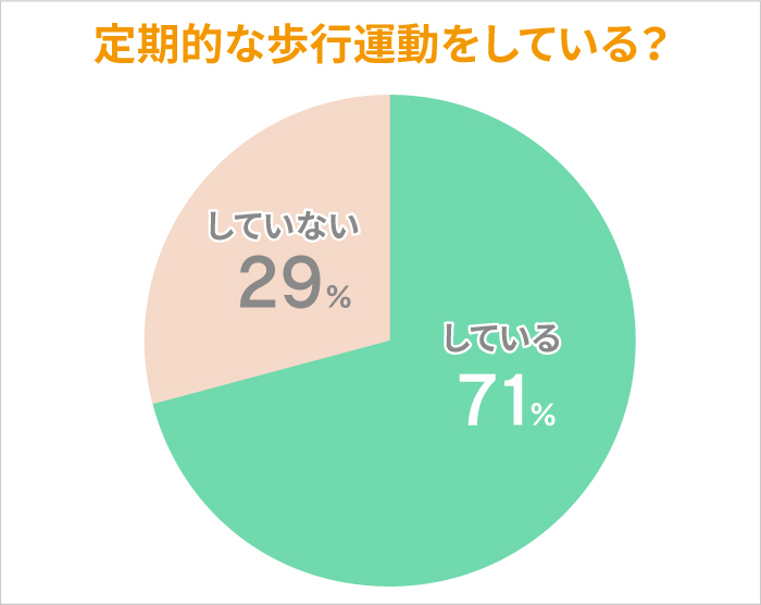 定期的な歩行運動をしているかどうか、との質問には、「している」が71%、「していない」が29%との結果に。多くの方が、定期的な運動として歩行を取り入れていることがわかりました。
