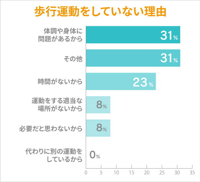 一方、「スマホアプリや歩数計を使った管理はしていない」方も37%いました。いちいち結果を記録するのが大変だと感じる方もいるかもしれません。そのために歩行そのものが面倒になっては本末転倒ですから、自分に合った、続けやすい歩行運動のやり方で行ってください。