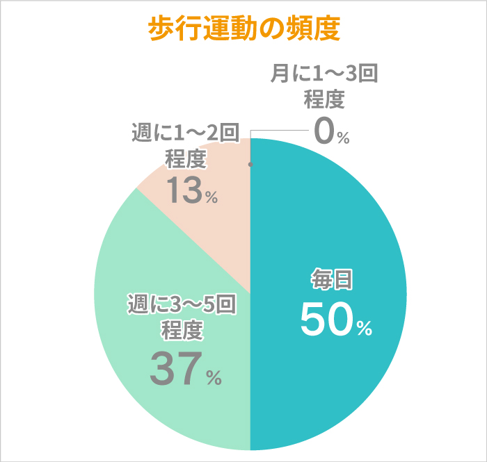 歩行運動を行う頻度は「毎日」が50%、「週に3~5回程度」が37%と、高い頻度で定期的な歩行を行っている人が、全体の9割近くを占めました。ほとんどの方が、おおよそ2日に1回以上のペースで歩いています。