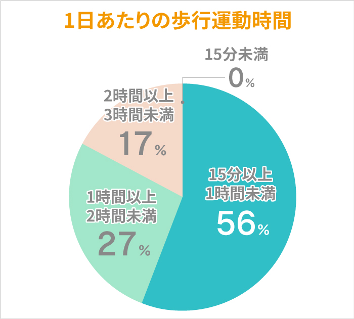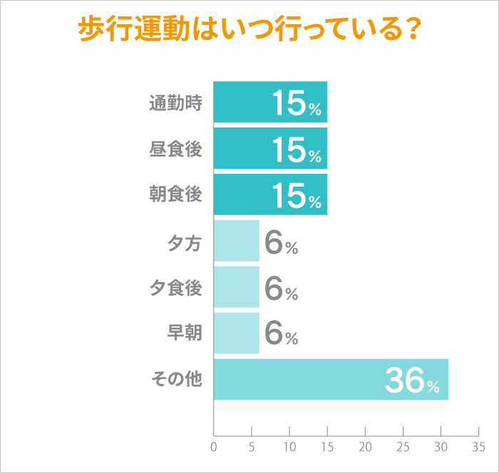 歩行運動を行っている時間は、「通勤時」「朝食後」「昼食後」が同率でいずれも15%、「早朝」「夕食後」「夕方」が同率で6%と、回答が分かれる結果となりました。その他の時間(食前、午前中、昼休み、外出時など)に行っている方も36%と、高い割合を占めていますので、ライフスタイルや身体の状態によって、歩行運動を行いやすい時間帯が違うようです。