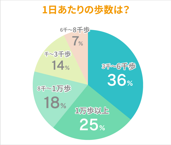 1日あたりの歩数は、3千歩~6千歩の方がもっとも多く(36%)、1万歩以上(25%)歩いている方がこれに続きました。具体的な数値としては、キリの良い1万歩との回答が多くあがっています。歩数計などを使っている場合には、目標の数値を決めておくのもいいですね。