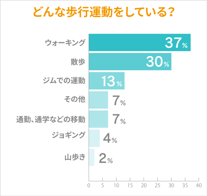 皆さんが実践している歩行運動の種類は、「ウォーキング」がトップで37%、続く「散歩」が30%との結果になりました。シンプルな歩行運動は、家の周りなど身近な場所で続けやすいのがメリットですね。