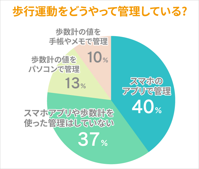 せっかく運動の時間をとっても、ただ歩くだけで結果が残らないと、モチベーションが下がってしまうこともありますよね。歩行運動の管理は、どのようにしているか聞いてみたところ、「スマホのアプリで管理」している方がもっとも多く、40%との結果でした。「パソコンで管理」(13%)、「手帳やメモで管理」(10%)をあわせると、60%以上の方が何らかの方法で歩行運動の管理を行っていました。