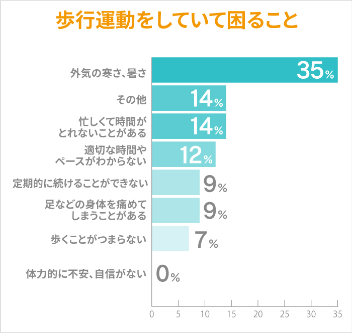 多くの方が、歩行運動をする際に困ることとして「外気の寒さ・暑さ」(35%)をあげました。「その他」(14%)の回答としても「天候」(女性・65歳)や「雨の日、公共トイレ」(男性・69歳)があがっており、歩行運動を行うには、気温や天候が大きな影響を持つことがわかります。確かに、熱中症の危険が高まる真夏の炎天下など、時間があっても歩行運動をするのに適さない時期もありますね。