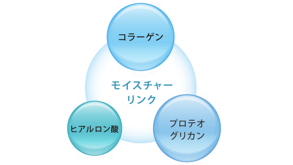 その代表的なアプローチが、世界で初めて(※1)化粧品に配合される、サンスター独自のうるおい成分「モイスチャーリンク」です。年齢とともにうるおい成分が減っていくと、肌は本来の力が発揮できなくなることに着目。もともと肌の中にひとつのうるおいの集合体として存在する、コラーゲン、プロテオグリカン、ヒアルロン酸を、本来の形に近い状態で化粧品に配合することに成功しました。この「モイスチャーリンク」が、単にうるおいを与えるだけでなく肌が自らうるおう力をサポート(※2)します。