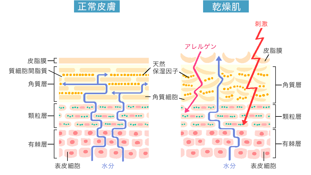 「肌の水分量が少ないと、皮脂の分泌が増えます。すると皮脂を食べるアクネ菌などの雑菌が増えて、ニキビや皮脂かぶれの原因になります。また、乾燥によりバリア機能が低下すると、ほこりやダニ、花粉などの異物が通過しやすくなるため、肌は敏感になり、かゆみ、赤み、湿疹、アレルギーなどの原因になるのです」