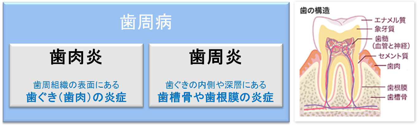 歯周病は、細菌の感染によって引き起こされる炎症性疾患です。歯を支えている組織のうち、歯肉(歯ぐき)のみが炎症を起こしている状態を歯肉炎、歯を支える歯槽骨や歯根膜に炎症が広がっている状態を歯周炎といい、その総称を歯周病といいます。炎症が進行すると、歯ぐきや歯槽骨、歯根膜などの歯周組織が破壊され、歯が揺れてうまくものが噛めなくなり、最後には歯が抜け落ちてしまいます。