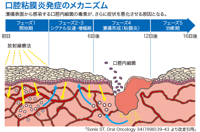 頭頸部領域の放射線治療では、口内炎の強い症状ができます。照射がはじまって7~10回目(14~20Gy※)のころになると、お口の中が赤くヒリヒリした感じがでてきます。