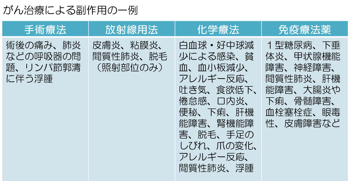 がん治療については、がんに罹患している部位やその周囲の組織にがんが潜んでいる可能性がある部位にアプローチをする手術療法と放射線療法、そしてカラダのどこかに潜んでいる可能性がある、または血液中の血球にがんがある場合にアプローチをする化学療法、さらに免疫療法などの新しい治療方法があります。どの治療も副作用が全くないというわけではありません。主な副作用としては、下表のようになります。