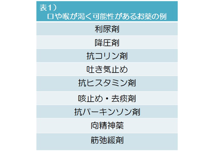 実は、その原因は多岐に渡っており、唾液腺の機能低下、加齢、ストレス(緊張や自律神経のバランス)、脱水(下痢、嘔吐、発熱、発汗、高血糖)、薬の副作用(表1)などによって引き起こされます。