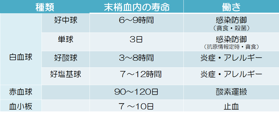 さらに血液の成分は、それぞれ役割が異なるだけでなく、寿命も決まっています。(下記グラフ参照)