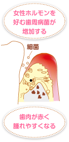 妊娠すると増える女性ホルモン。女性ホルモンは歯周病の原因菌やその他の菌の繁殖を促進するため、歯ぐきに炎症反応が起こりやすくなります。つわりなどでお口のケアがおろそかになると歯肉の状態がどんどん悪化しやすくなるという悪循環に。