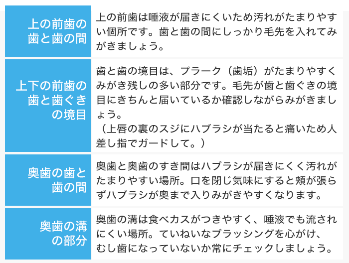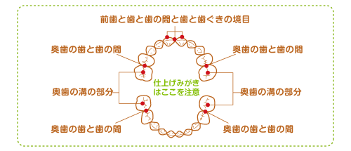 仕上げみがきのとき、ハブラシを横に動かしてゴシゴシとみがいていませんか?ゴシゴシみがきでは歯の表面しかみがけません。せっかく歯みがきをしても、わずかでもみがき残しがあると細菌はどんどん繁殖してしまいます。しっかりとプラーク(歯垢)を落とすための仕上げみがきの仕方を学びましょう。