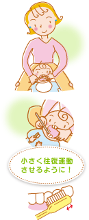 ママが脚を伸ばして座り、その上に子どもを仰向けに寝かせます。ママの両脚で子どもをはさむようにして、口の中を上からのぞきこみます。脇をしめるとハブラシを持つ手が安定します。もし仰向けを嫌がるようなら向かいあう形でもよいでしょう。