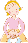 ママがペタンと座って足を軽く開き、子どもの頭を膝の間にはさんで固定します。