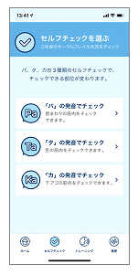 スマートフォンのマイクに向かって「パ」「タ」「カ」をそれぞれ5秒間に何回発音できるか計測。「パ」の音で食べ物を口からこぼさない唇の働き、「タ」の音で上あごにしっかりくっつく舌の働き(食べ物を押しつぶす、飲み込む)、「カ」の音で誤嚥せずに食べ物を食道に送る筋肉の働きをチェックします。