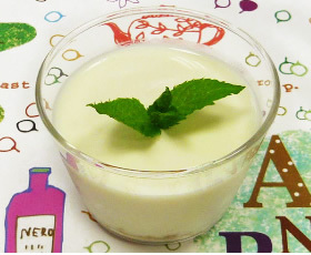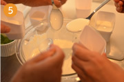 小プラカップに(4)を静かに注ぎ入れ、冷蔵庫で冷やし固める。