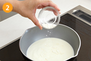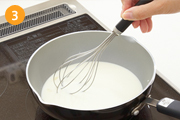 鍋で牛乳を熱し、砂糖・杏仁霜を加えて溶かす。
