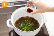 (2)に(1)と醤油を入れて、ひと煮立ちさせ火を止めたら完成。