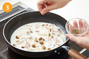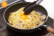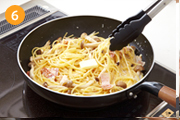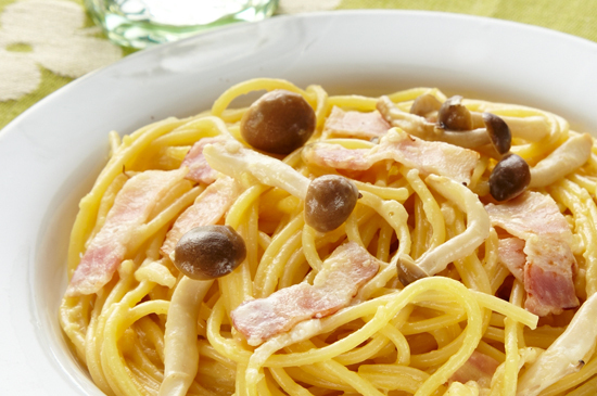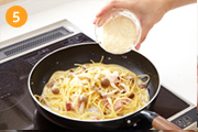 スパゲッティをゆでる時の塩はなくてO.K.です。濃厚な味のソースには、太めの麺がおすすめです。フェットゥチーネ(平たい麺)もよく合います。仕上げにお好みで、あらびきこしょうをかけても美味しい!