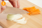 にんじんは千切り、玉ねぎは薄切りにする。
