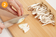 しめじは石づきを切り落とし手でほぐし、長ねぎは斜め薄切りにする。
