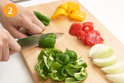 玉ねぎ、ピーマン、パプリカを乱切りにする。