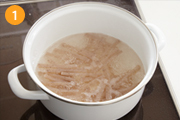 こんにゃくは3mm程度の短冊切りにし、あく抜きのため茹でておく。