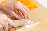 にんじんは千切り、長ネギはみじん切り、青ねぎは小口切りにする。