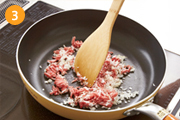 テフロン加工のフライパンに合挽き肉と長ネギを入れ、弱火~中火で炒める。