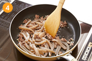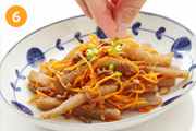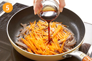 (4)を水分を飛ばしながら炒め、にんじんと材料A(調味料)を加えて炒める。