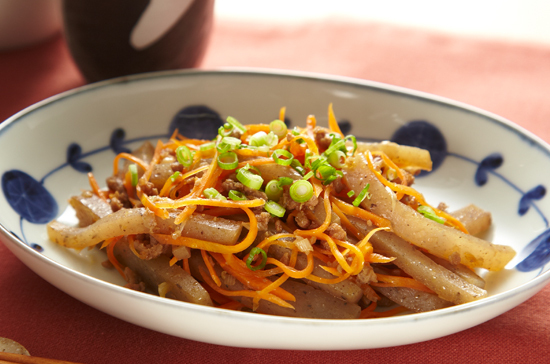 こんにゃくで満足感・ボリューム感たっぷり、挽き肉でコクがプラスされたヘルシーきんぴら♪こんにゃくが主役級のおかずになります!