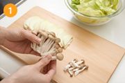 キャベツはざく切り、玉ねぎは薄切り、しめじは石づきを落として手でほぐす。