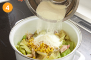 こしょうで味を調えたら、冷凍コーンとスキムミルクを入れる。