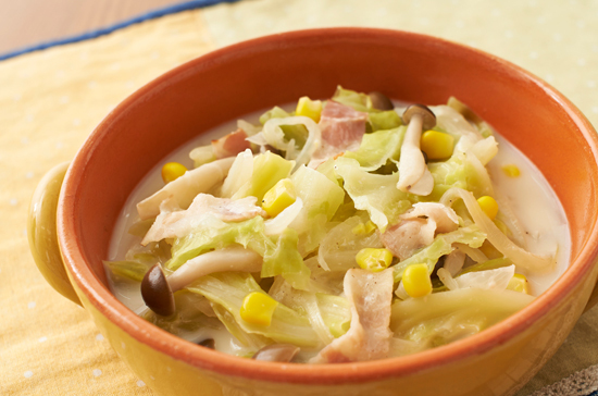 脂質は控えて、カルシウムたっぷり♪スキムミルクで簡単!どっさりキャベツが食べられる、冬に美味しい食べるスープです。