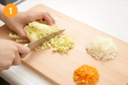 にんじん、玉ねぎ、キャベツをみじん切りする。
