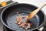 テフロン加工のフライパンでひき肉を炒め、塩・こしょうで味付けする。