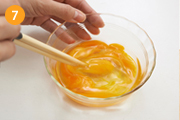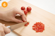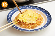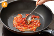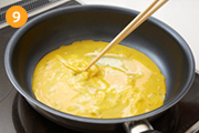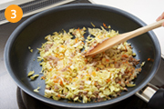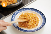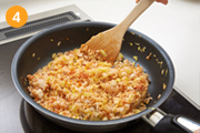(3)にごはんを加えて炒め、さらにケチャップを加えて混ぜ合わせる。