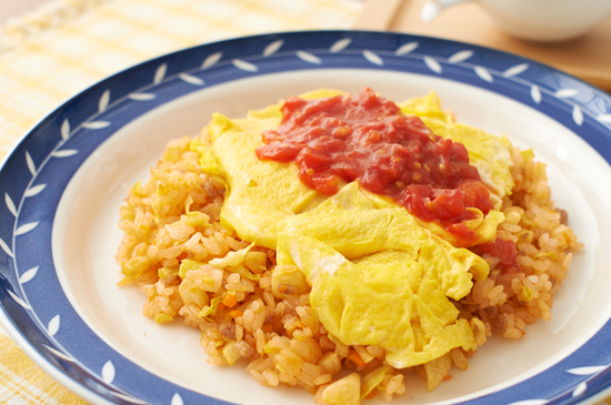 キャベツでボリュームアップ!さっぱり酸味の効いたトマトソースで、塩分控えめ、満足感大!のオムライス♪