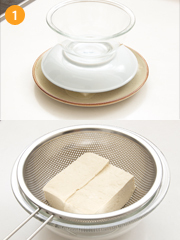 豆腐は重しをして20分、またはざるに移して15分ほど置いて、水切りをする。